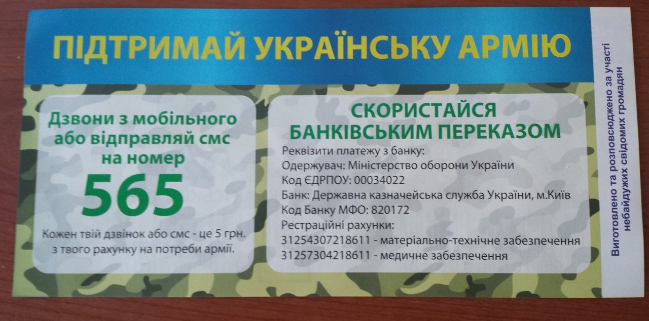 У місті Тернопіль активно поширюється інформація із закликом підтримати українську армію, зателефонувавши за номером телефону 565, що дасть можливість фінансово внести свою частку на підтримку збройних сил України. Фінансове стягнення досить символічне для кожної людини, проте результат свідчить про небайдужість, активність та співпереживання кожного мешканця країни.